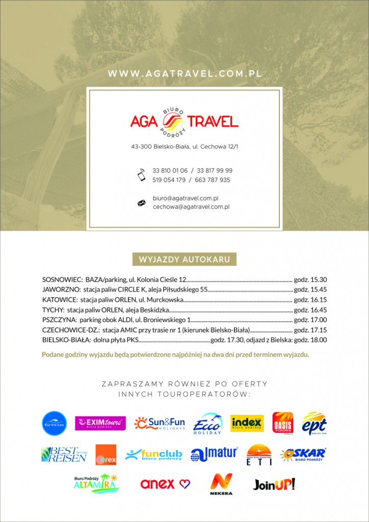 Strona www używa cookies i podobnych technologii m.in. w celach: świadczenia usług, reklamy, statystyk, logowania do strony. Korzystanie z witryny bez zmiany ustawień Twojej przeglądarki oznacza, że będą one umieszczane w Twoim urządzeniu końcowym. Ustawienia te można zmienić w ustawieniach przeglądarki internetowych. Korzystając z tej witryny wyrażasz zgodę na używanie cookies. Więcej informacji na stronie: https://www.agatravel.com.pl/polityka_prywatnosci,strona480.html